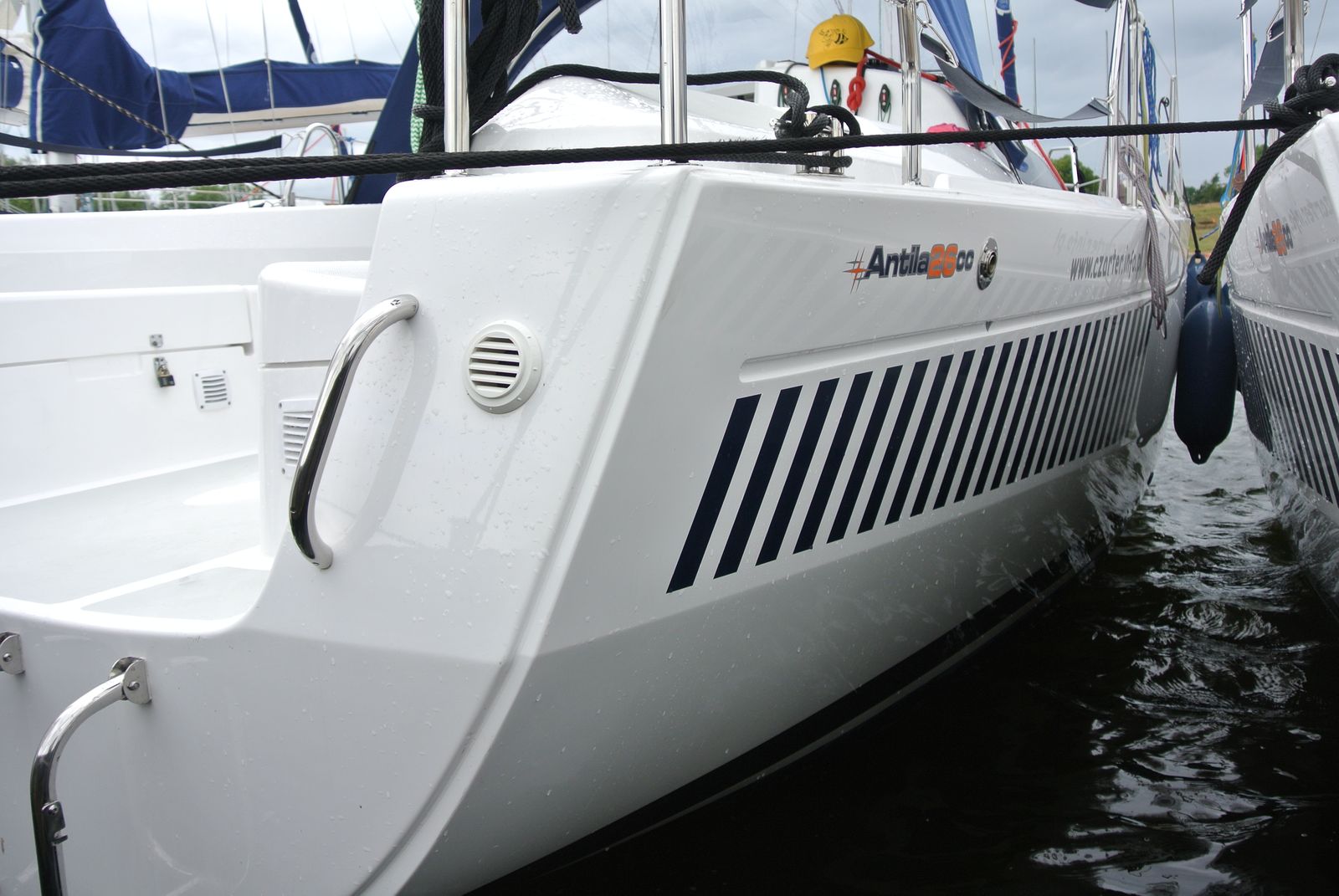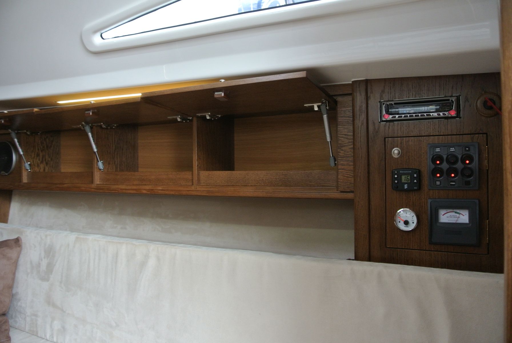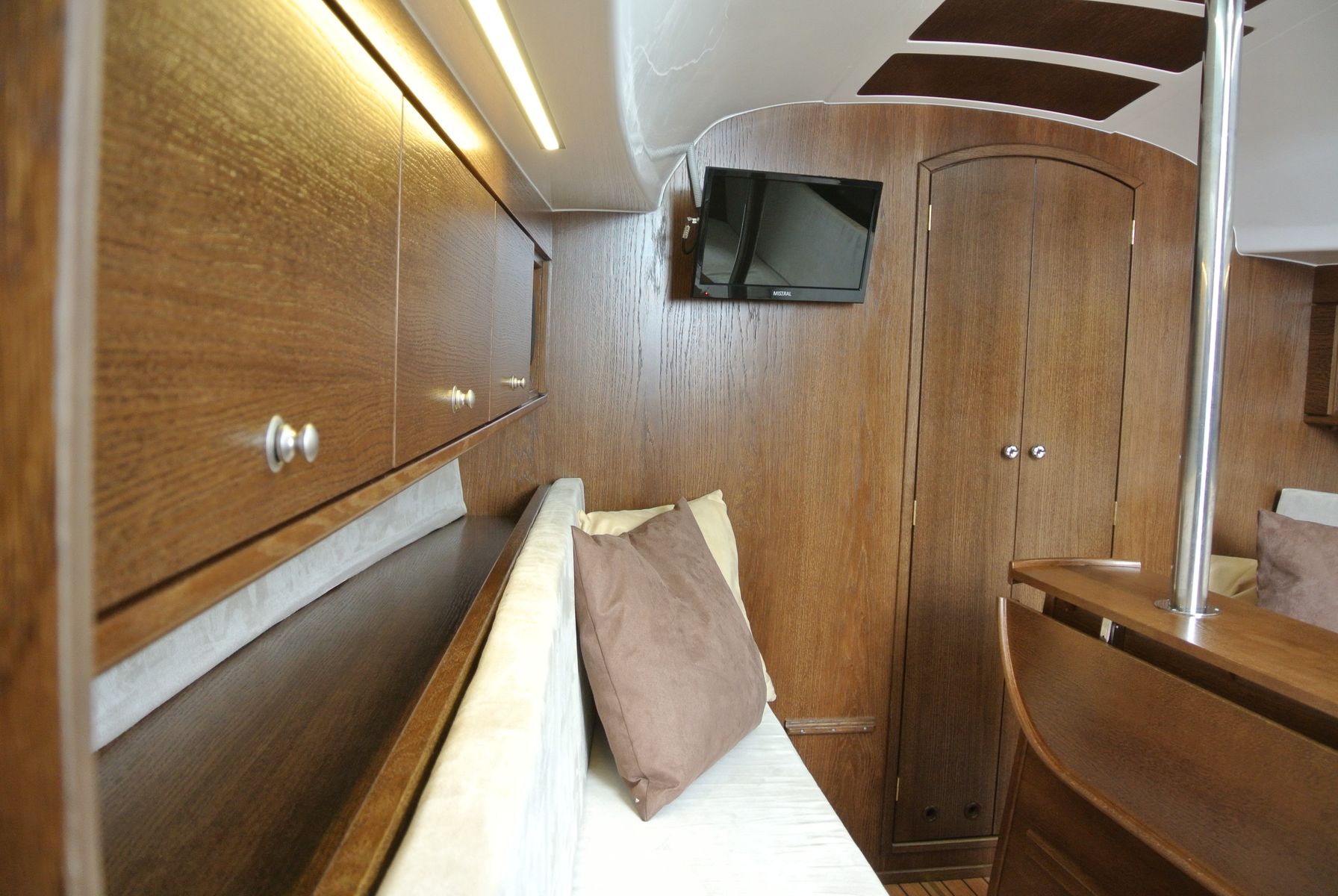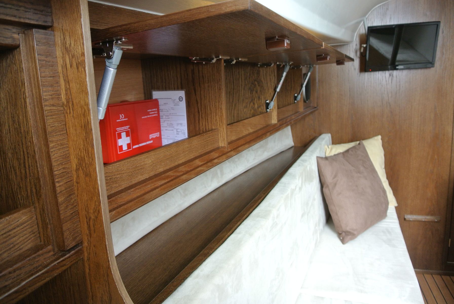 Wyposażenie dodatkowe: bramka do kladzenia masztu, sztywny sztag, roll fok, instalacja wody - zbiornik, radio, CD, TV, lodówka, ogrzewanie, instalacja 230 V, oświetlenie kokpitu