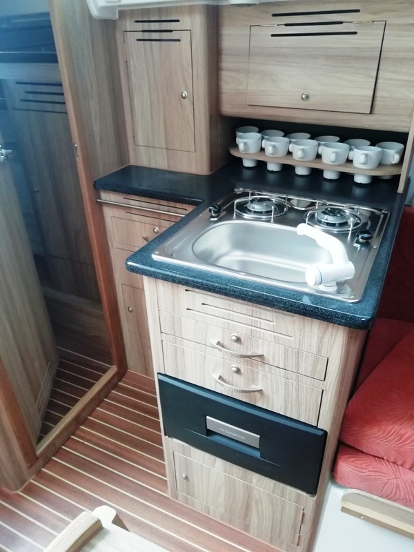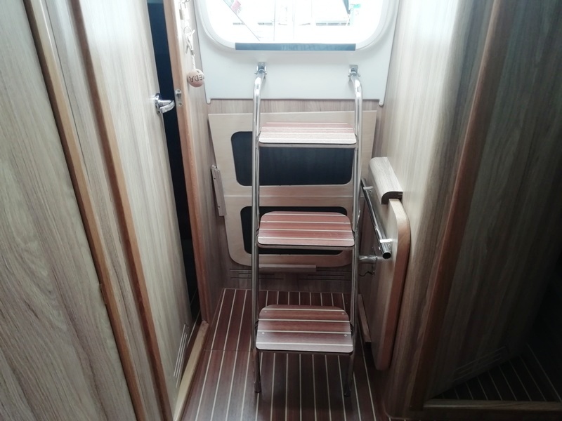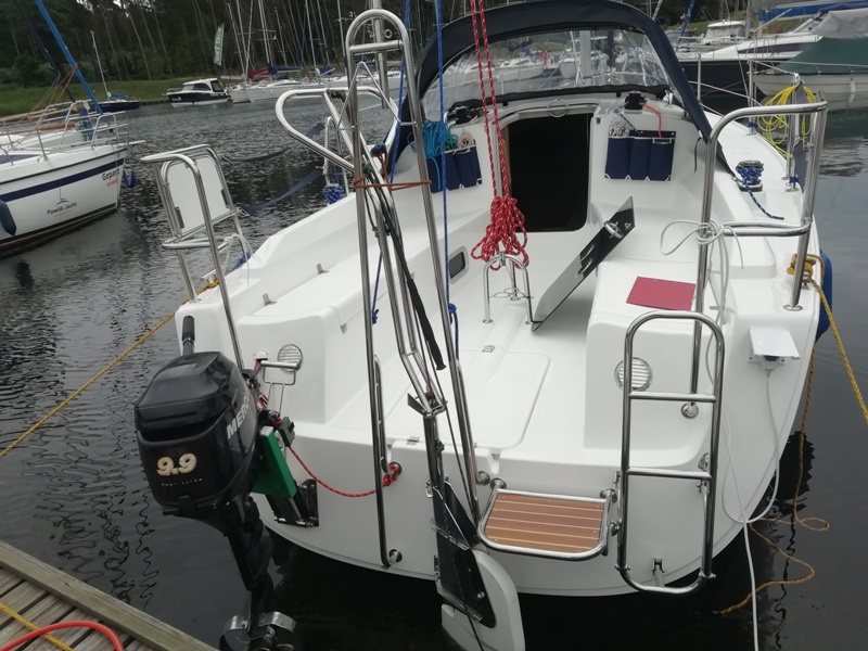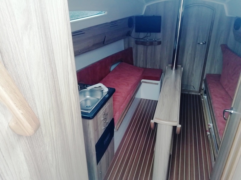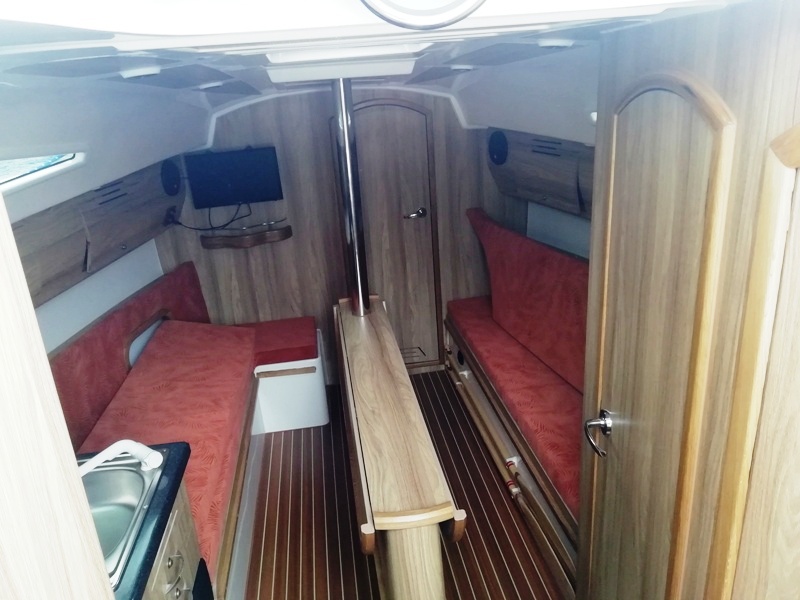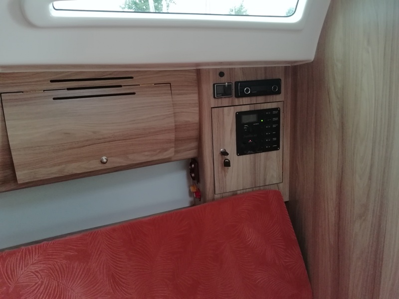 Wyposażenie dodatkowe: bramka do kladzenia masztu, sztywny sztag, roll fok, lazzy jack, bimini, instalacja wody - zbiornik, radio, mp3, TV, lodówka, ogrzewanie, instalacja 230 V